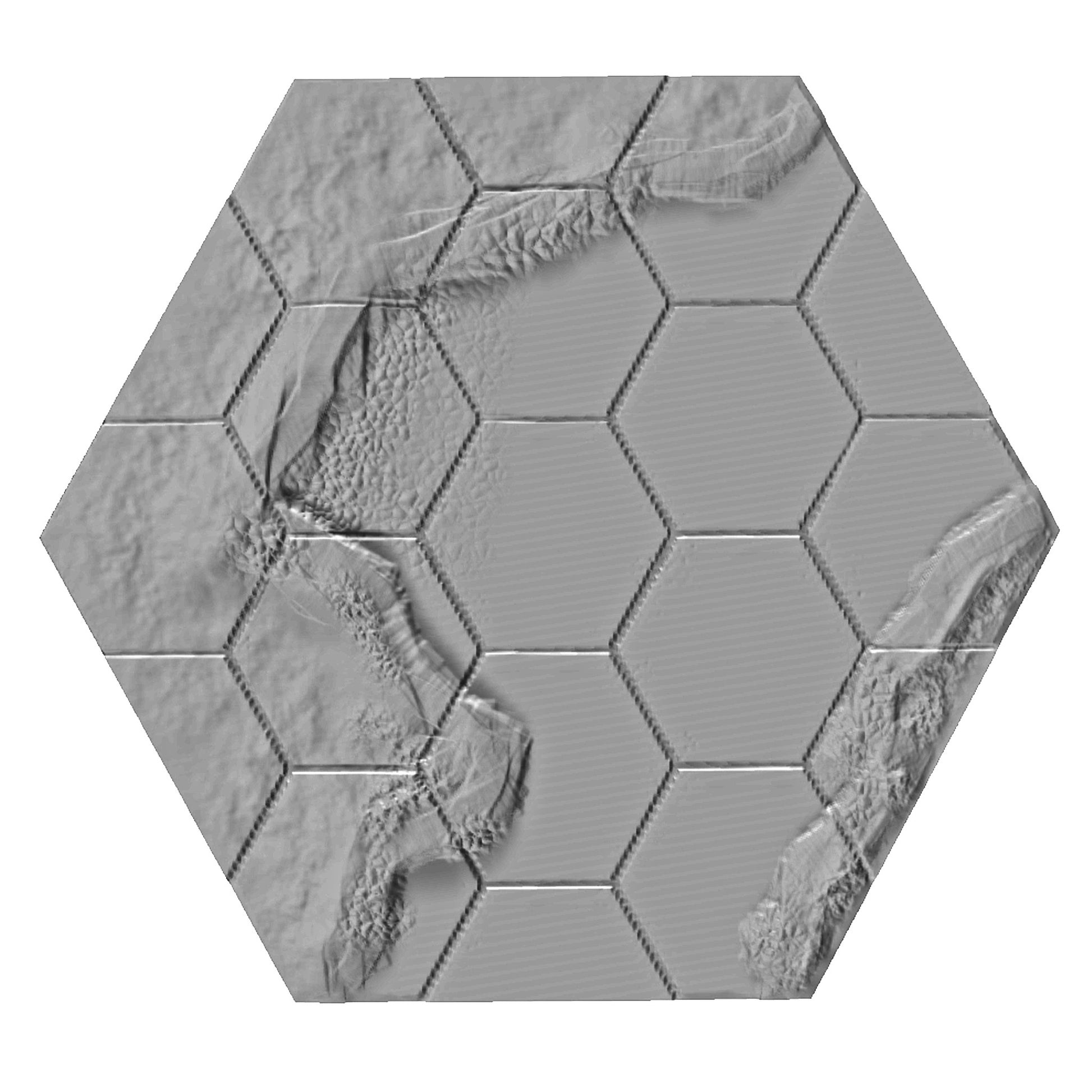 5.1-inch hexagonal tile (152x132mm). Divided into 1.25-inch hexagons for your favourite games such as Battletech.