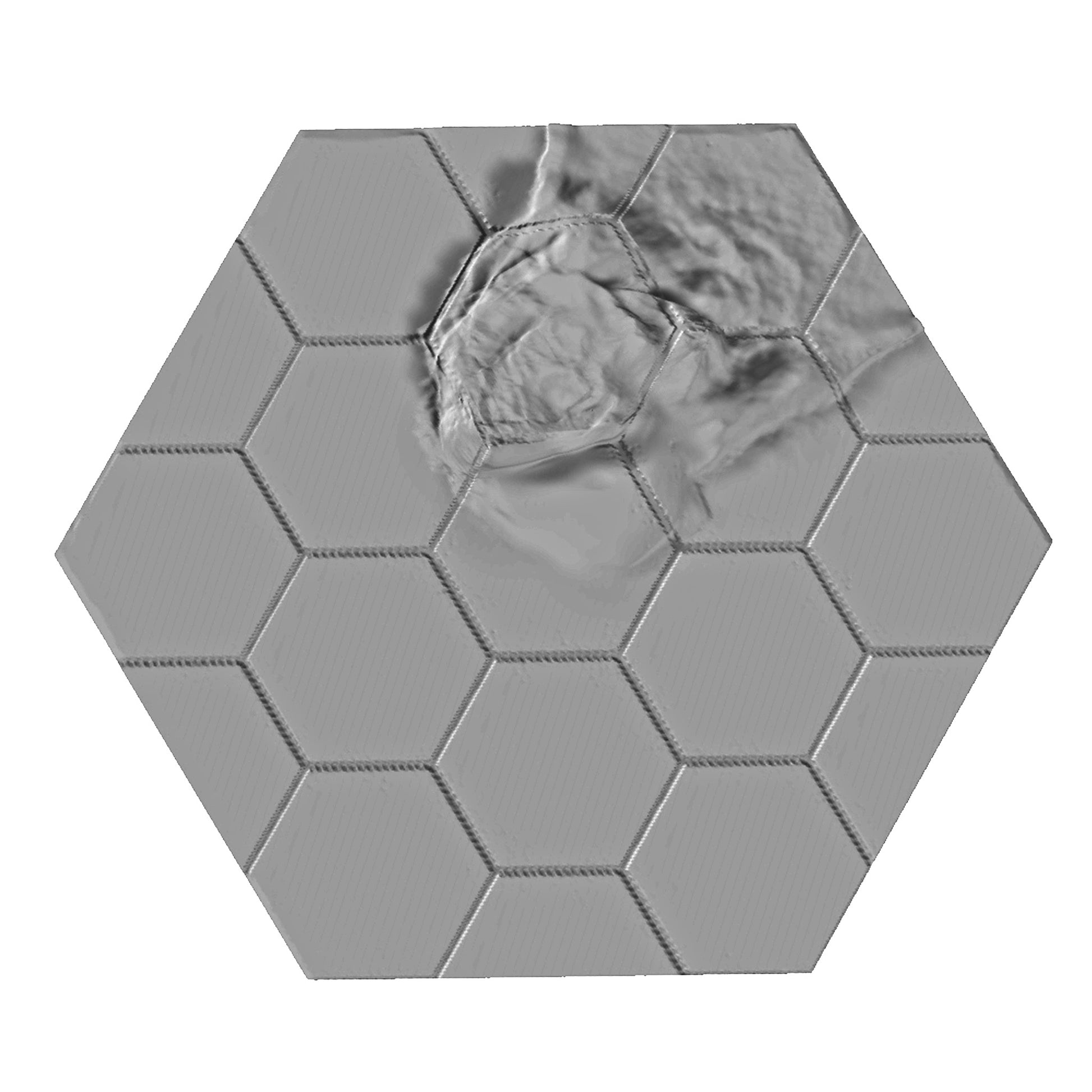 5.1-inch hexagonal tile (152x132mm). Divided into 1.25-inch hexagons for your favourite games such as Battletech.
