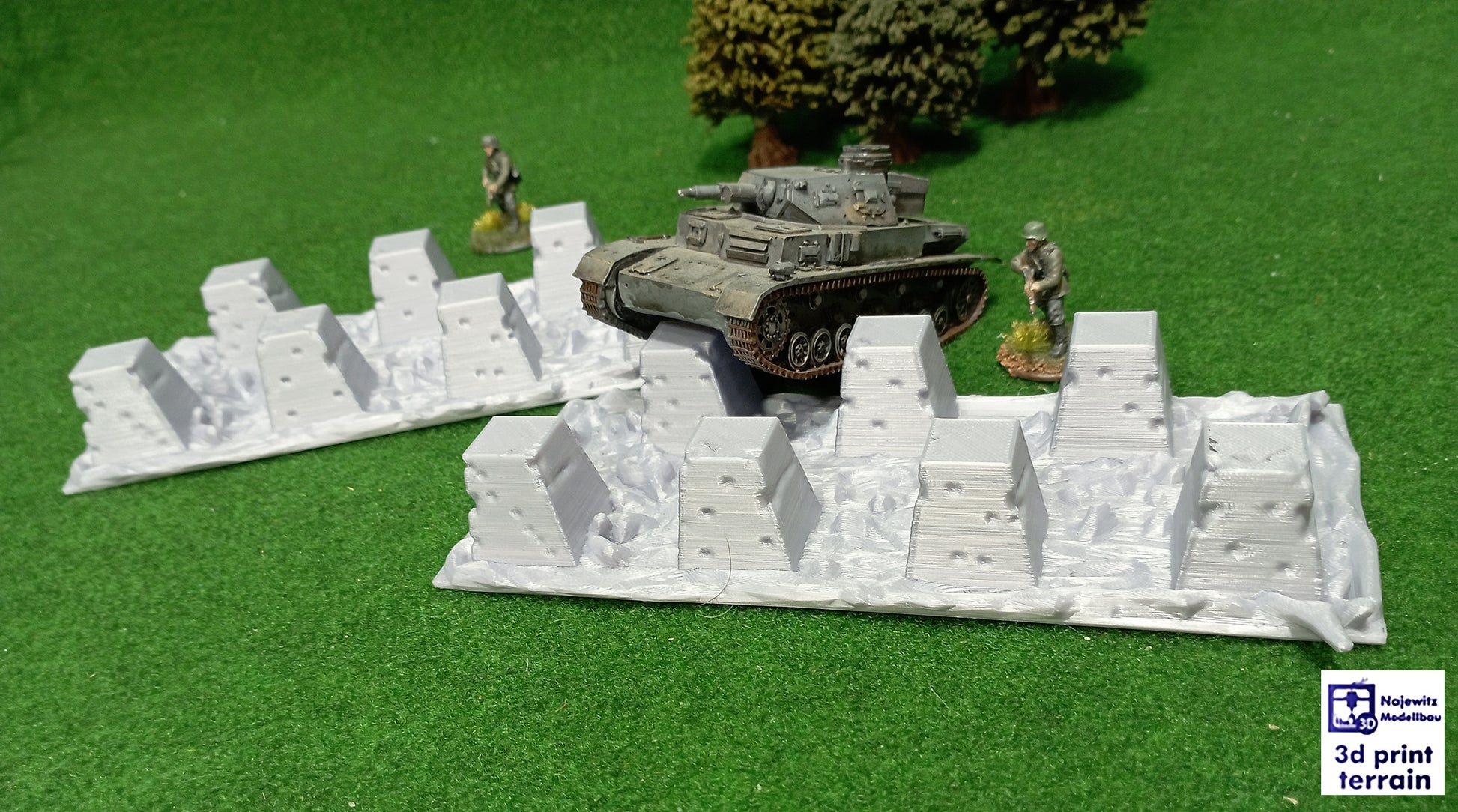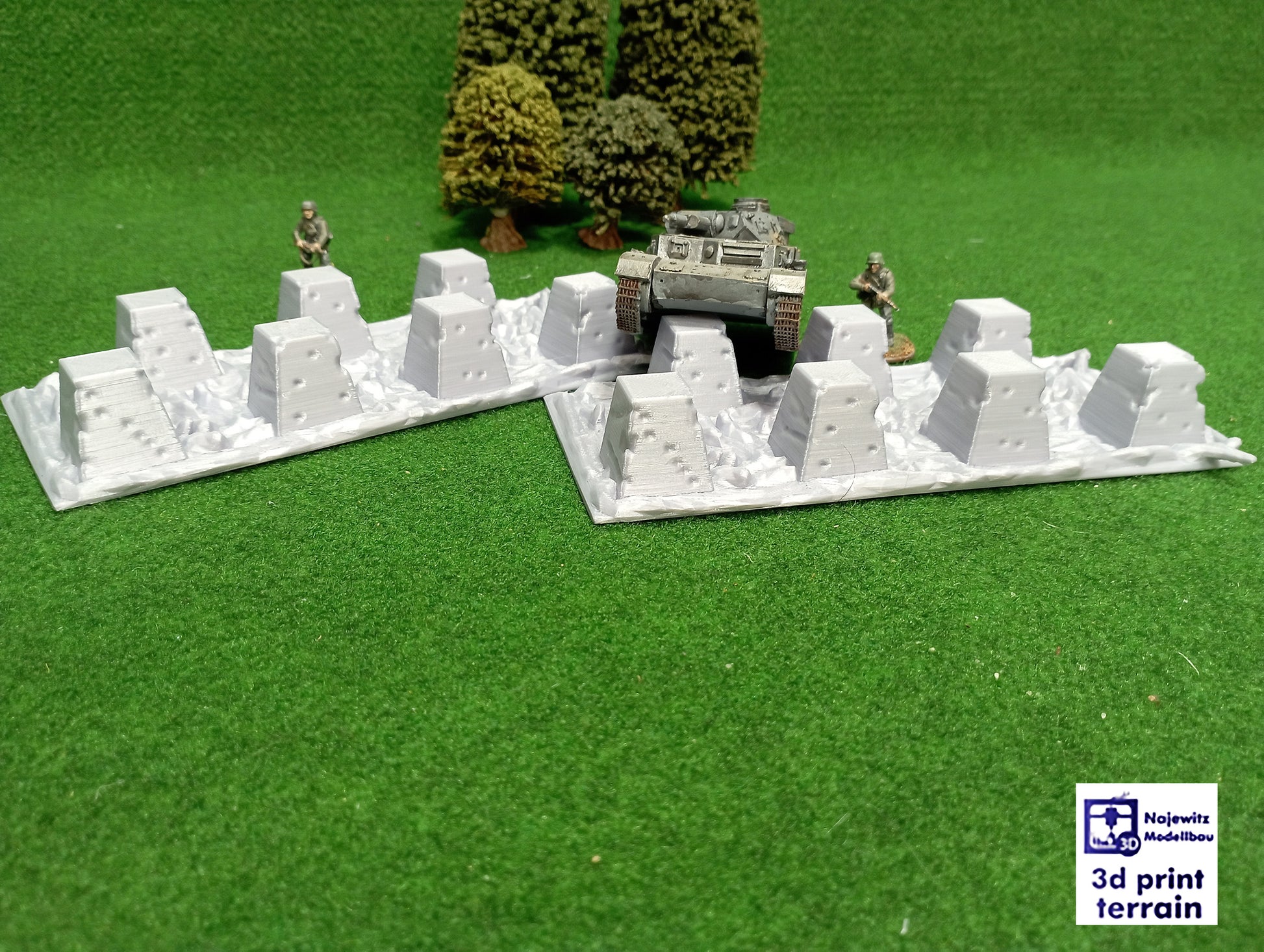 Set of 2 pieces of anti-tank obstacle. Dragon's teeth are square-pyramidal fortifications of reinforced concrete first used during the Second World War to impede the movement of tanks and mechanised infantry. The idea was to slow down and channel tanks into killing zones