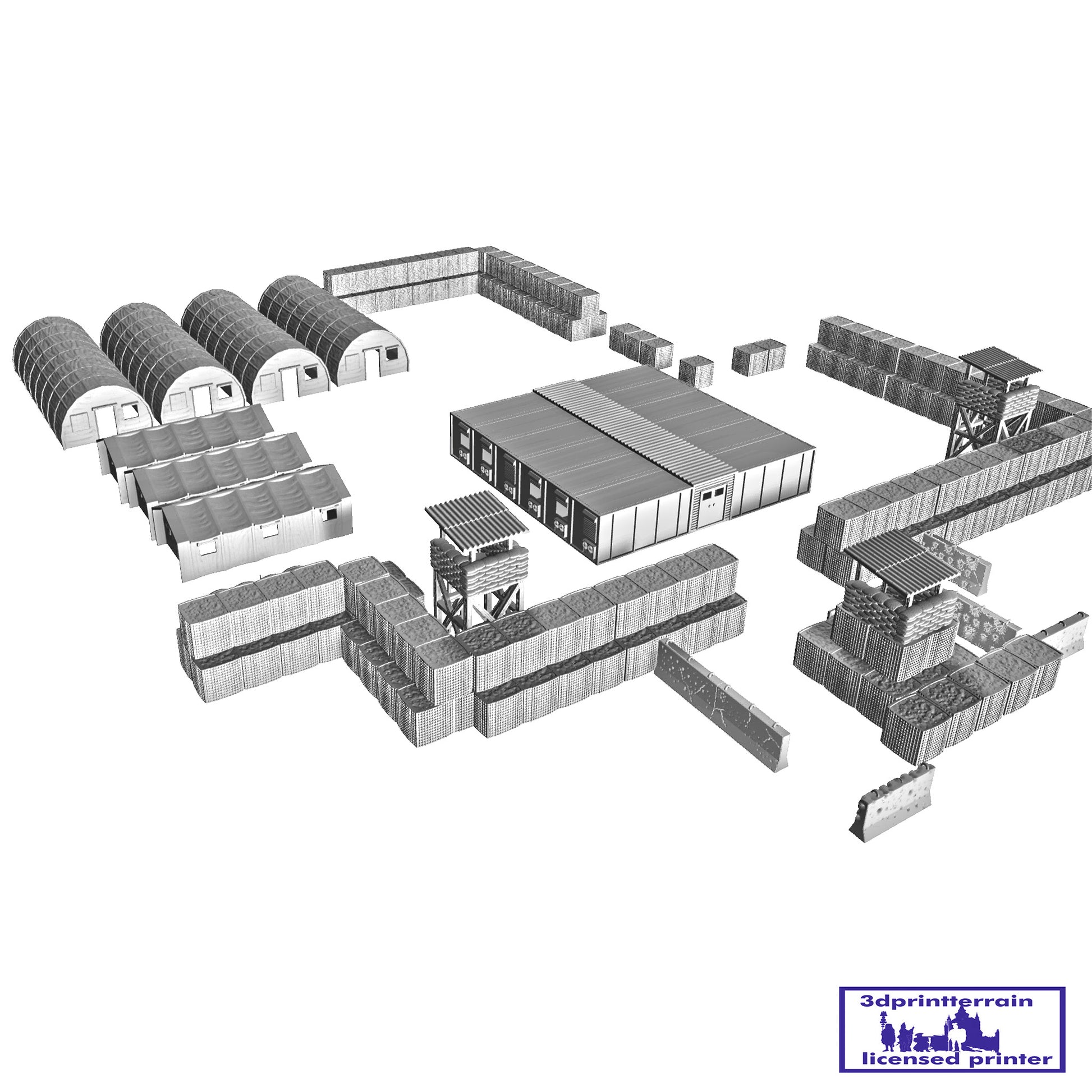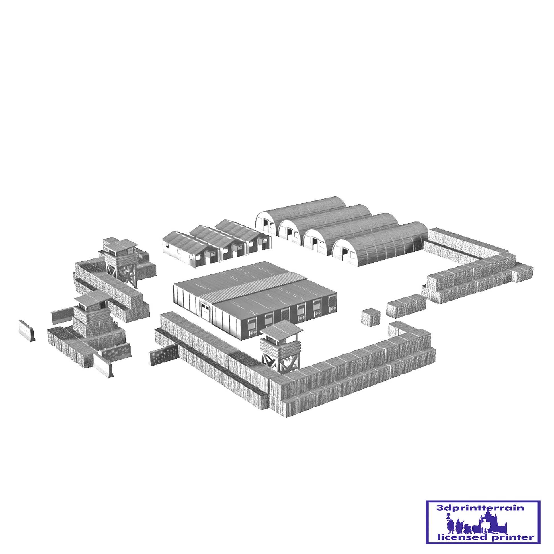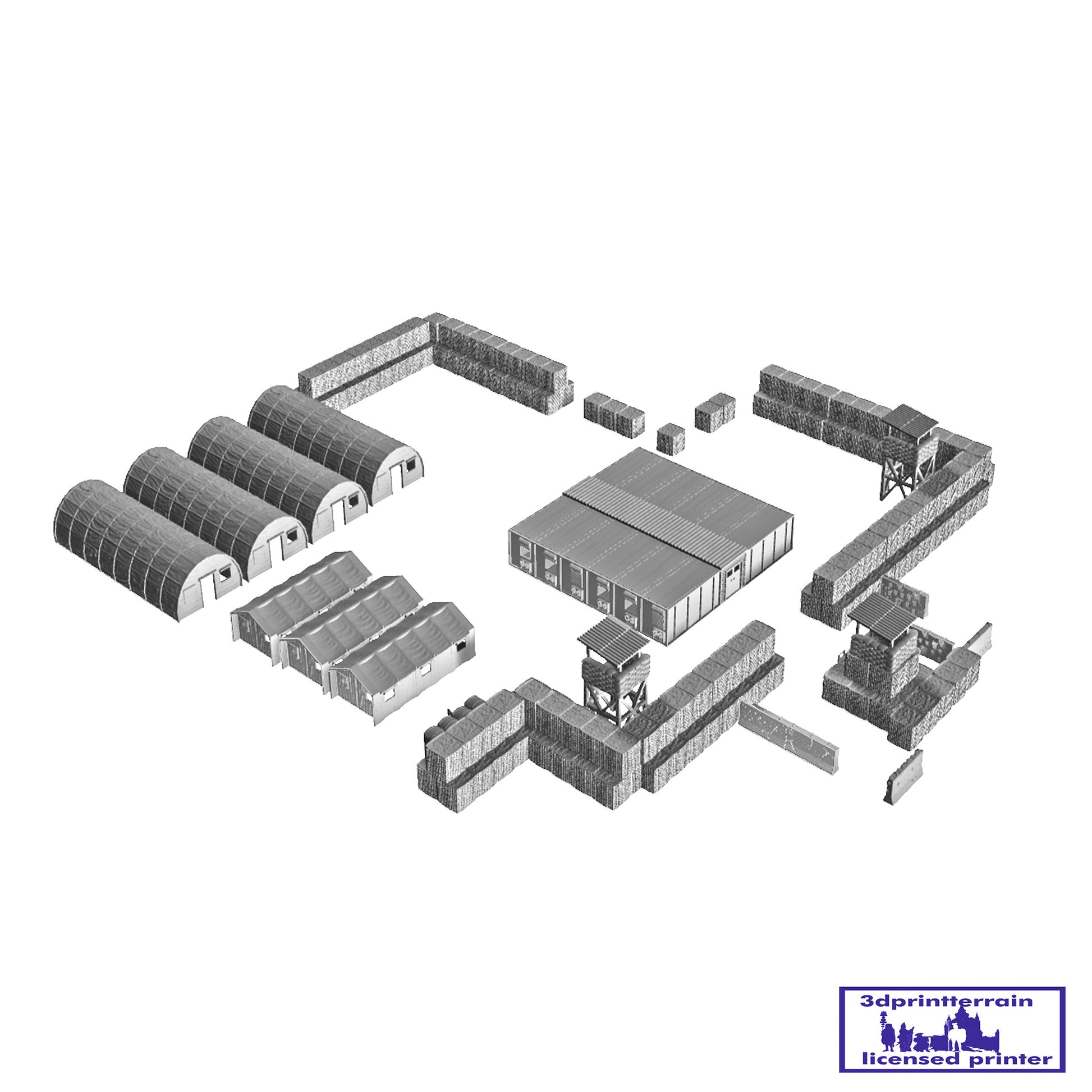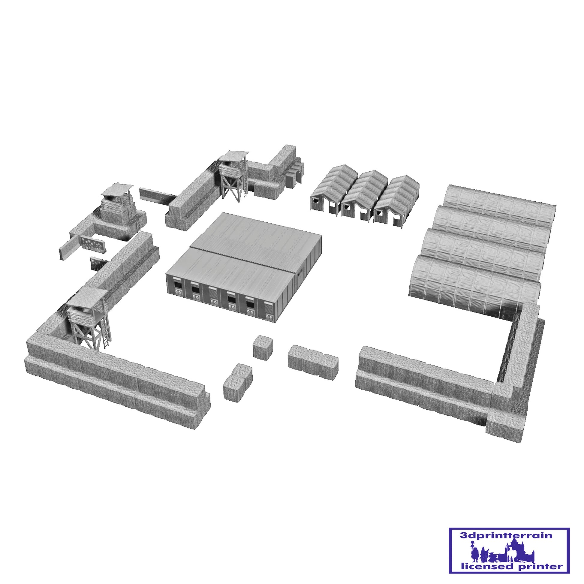 Set of parts to build a modern American camp. Includes various types of Hesco, Damaged Barriers, Watchtowers, Tents, Container Barracks and Portable Toilets.